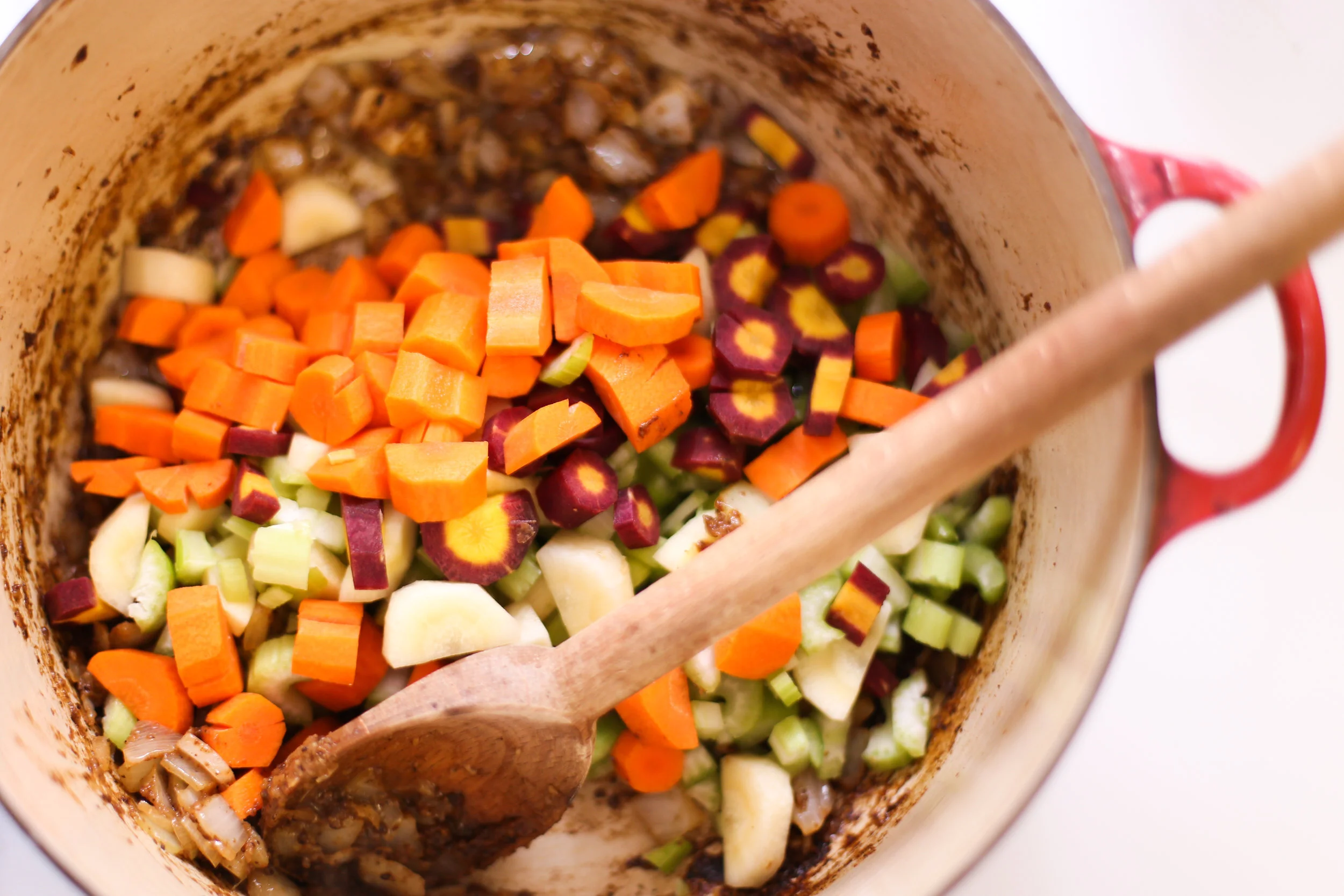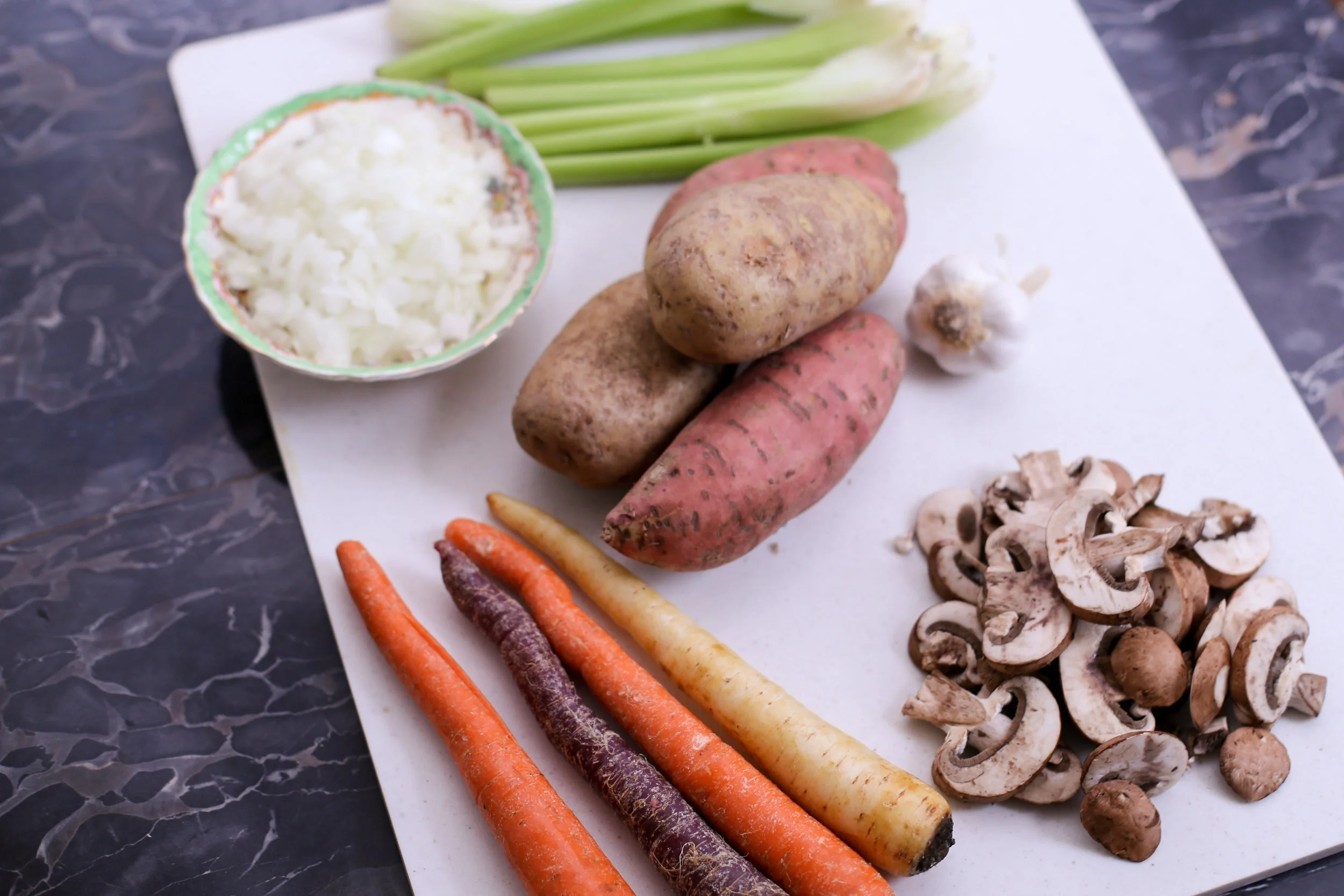 Start by prepping the veggies - dice onion, chop carrots, dice celery, cube potatoes, etc.