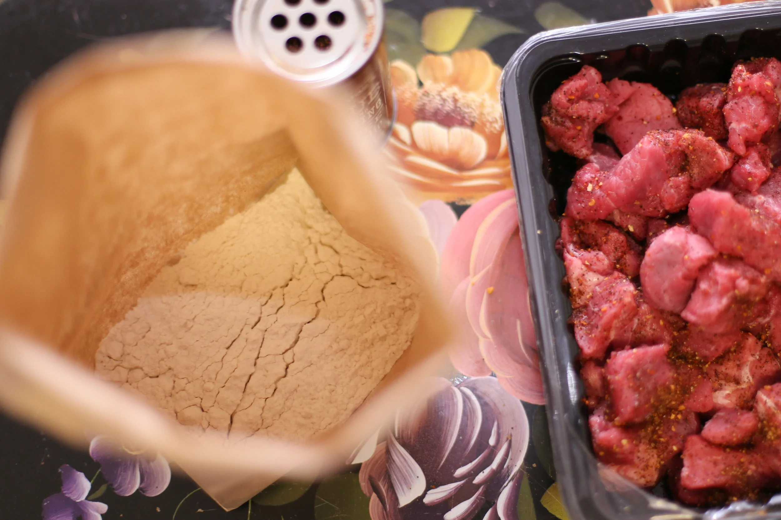 next, season your lean stew meat and fill a brown paper sack with some flour...