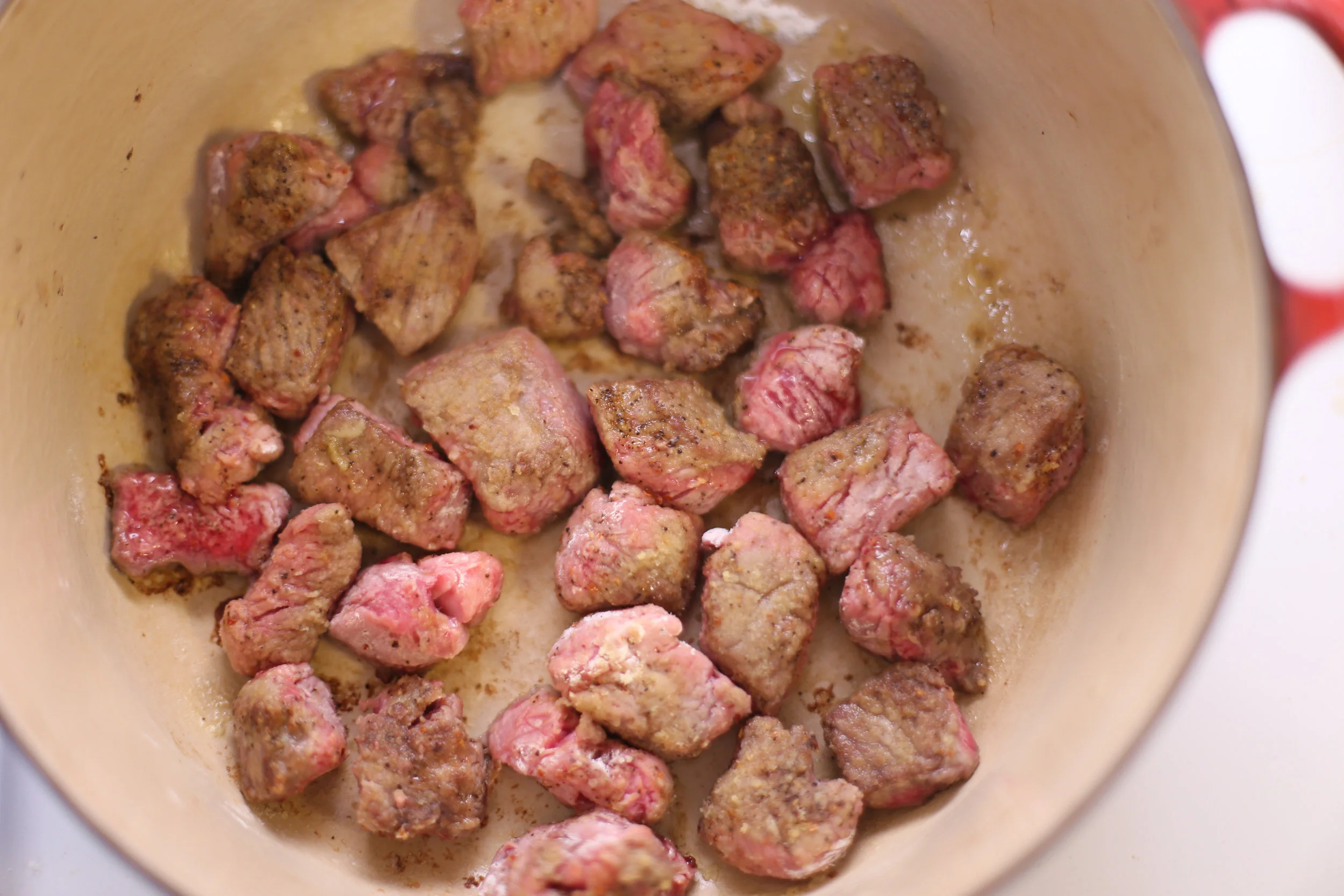 Brown the meat - you don't want to cook it all the way through, you just want the insides pink and the outside brown all the way around - don't overcrowd the pan, it will most likely take two batches to get all the meat brown, if you have to, add some more olive oil