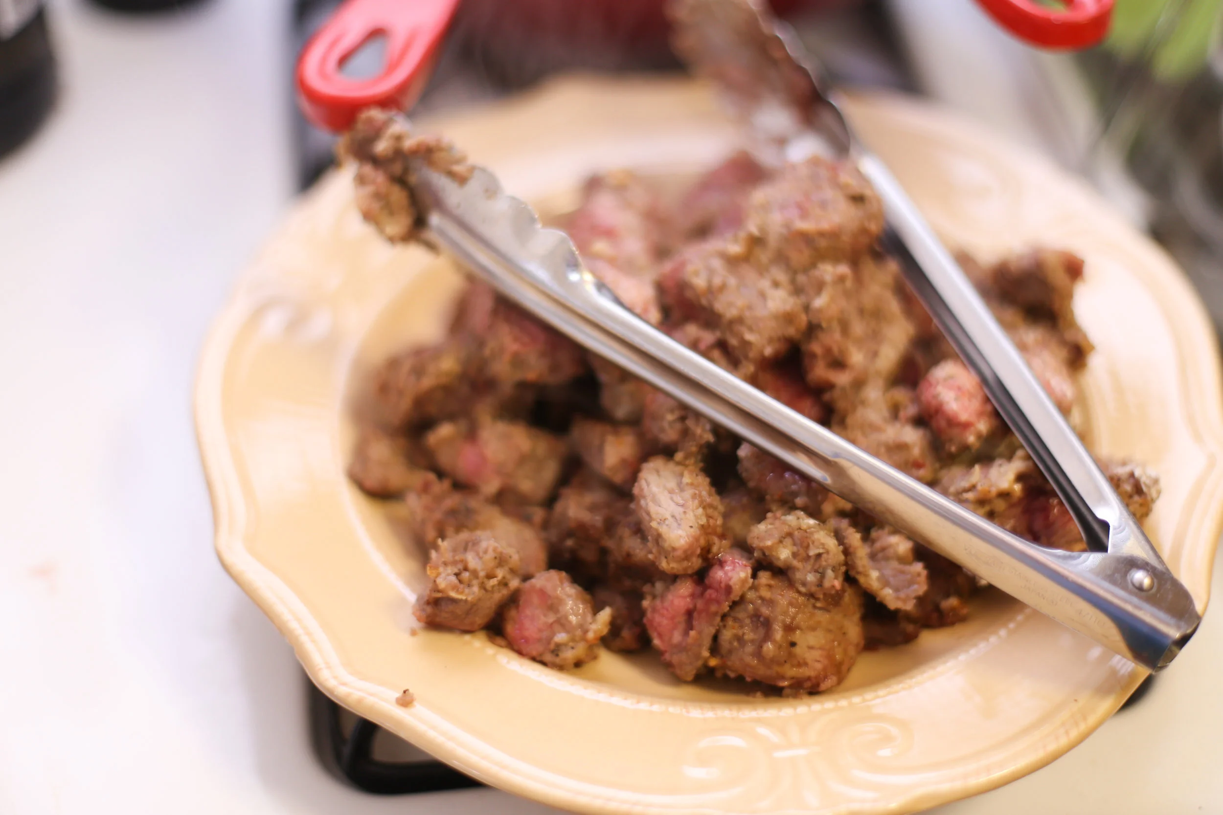 Fill a paper bag with flour and the seasoned meat and shake it until all the cubes are evenly covered