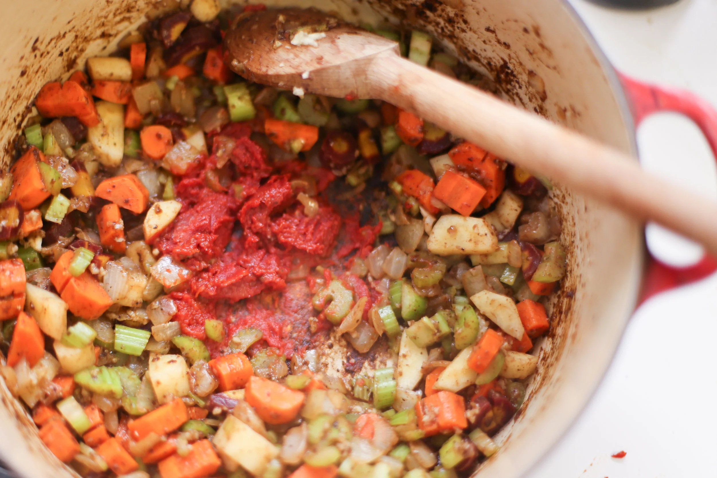 Let the tomato paste get hot and maybe a little brown in the middle of the pan - about 2 minutes