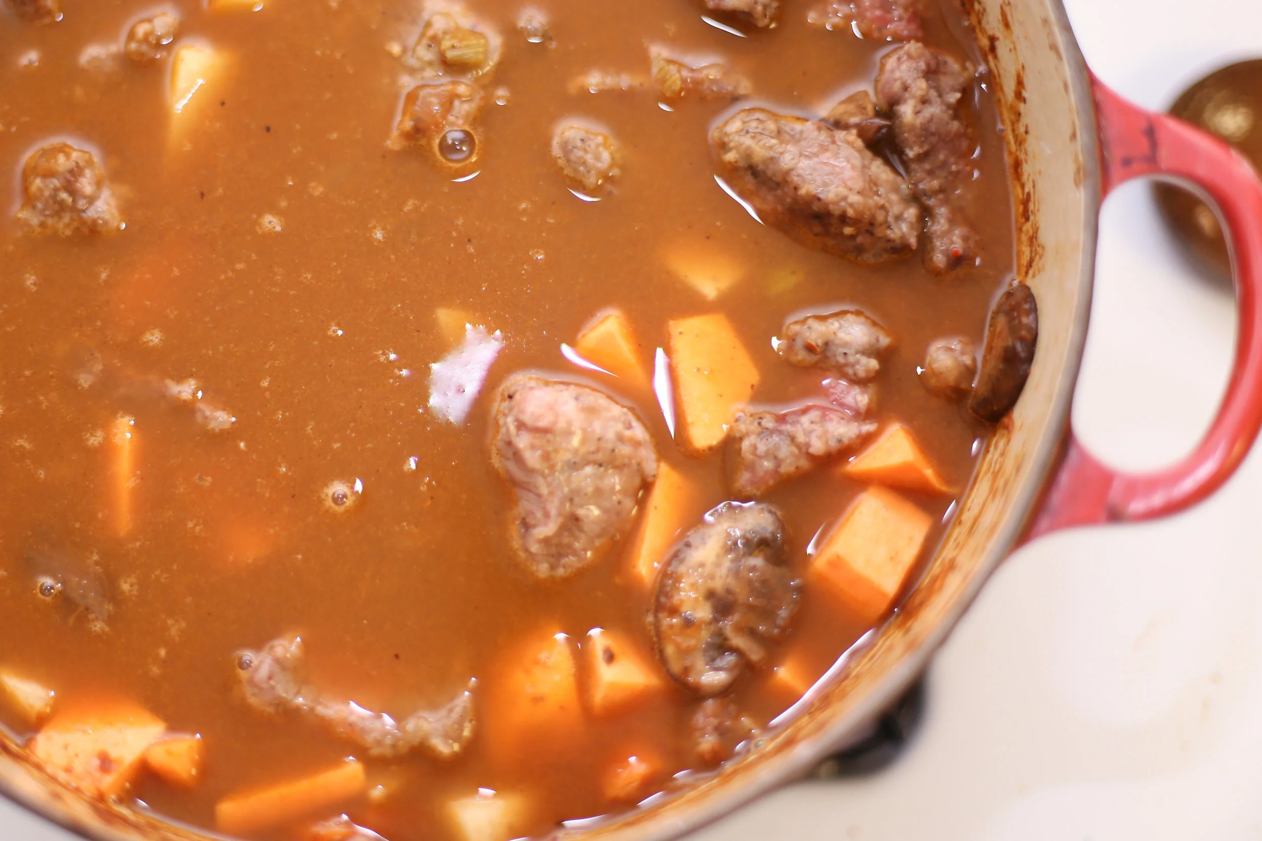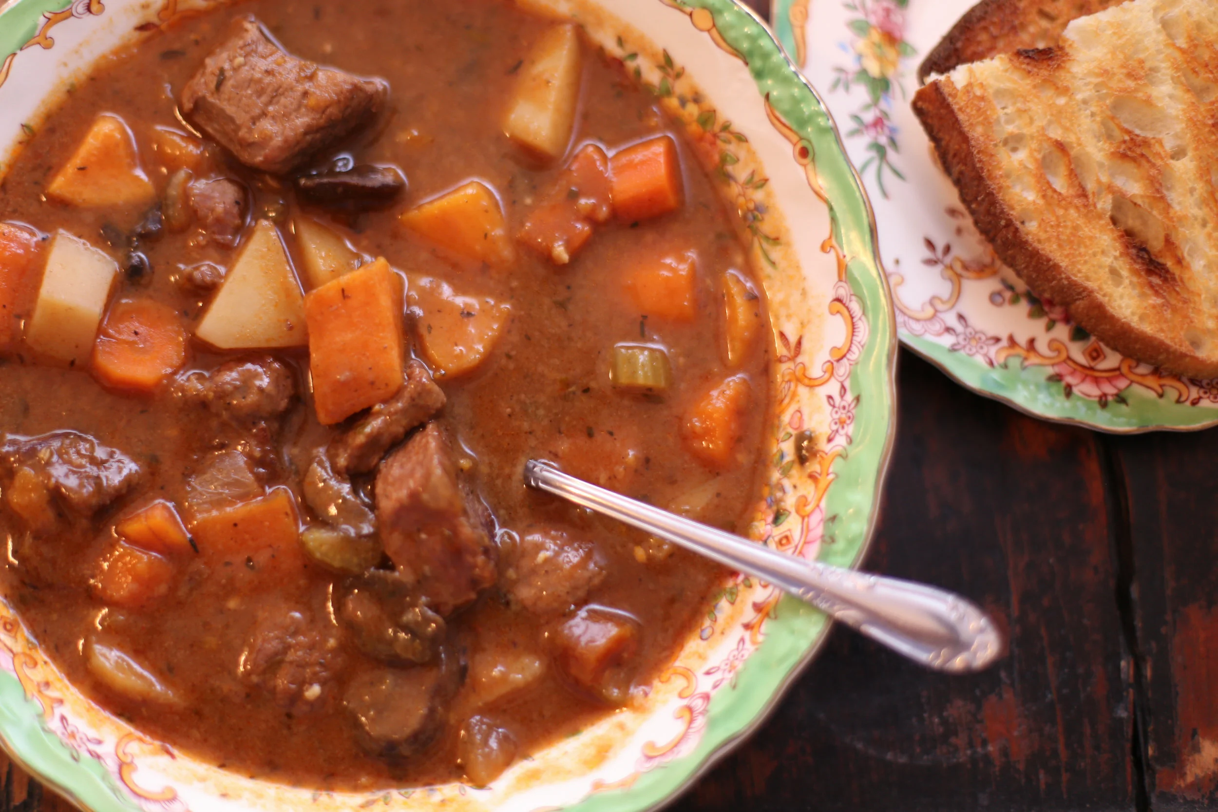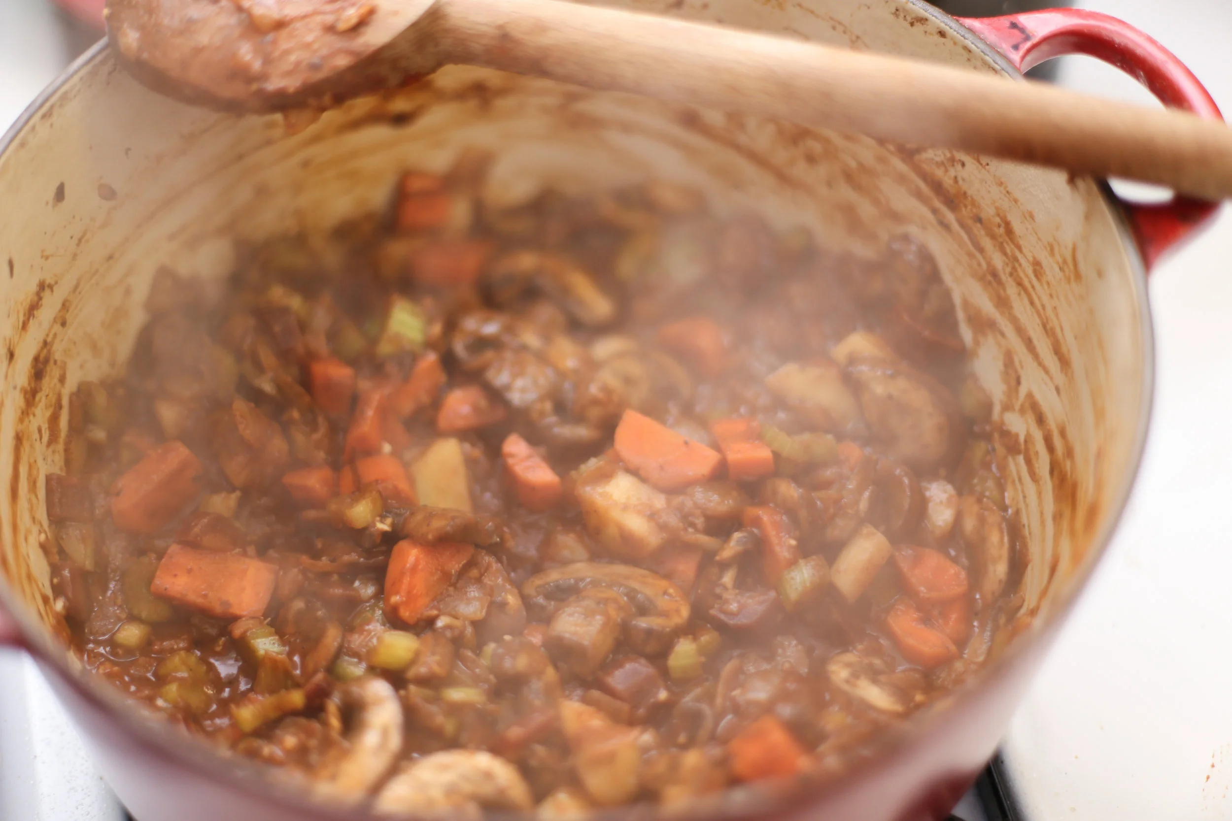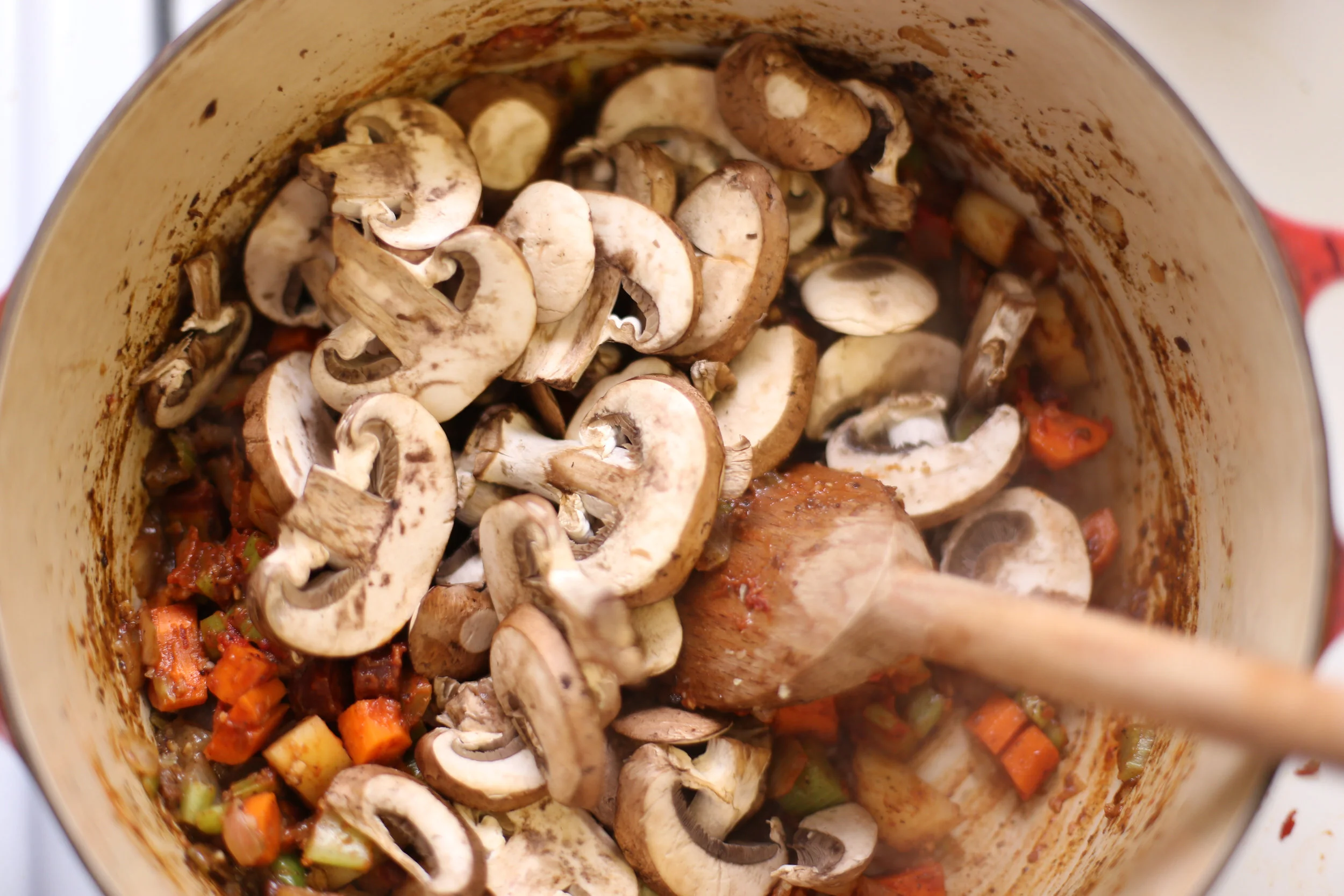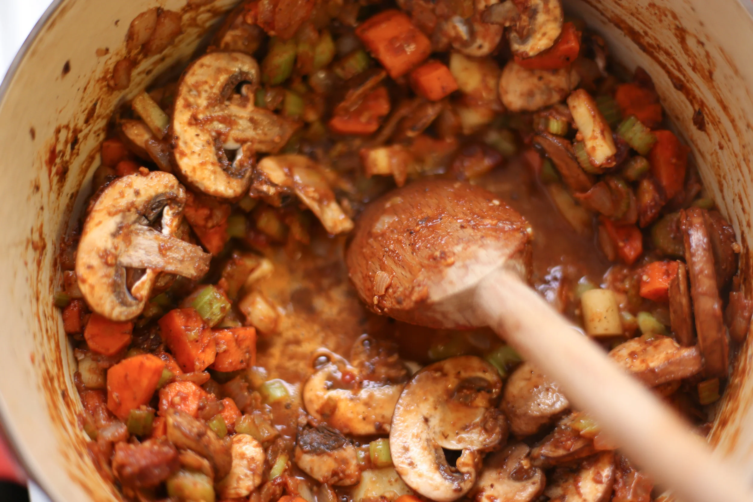 There's very few pots, pans, utensils or kitchen tools that I think every kitchen should have, for the most part I think most "tools" are a little excessive. I mean c'mon an avocado slicer... really? However, on that short list of things you must have, a dutch oven is number one or two. I use it so often, especially in the fall and winter, I wish I had two. If you don't have a dutch oven, it's okay... you can still make this amazing stew, you'll just have to use a saute pan and a big soup pot. What the dutch oven allows you to do is keep a constant temp going as you brown your meat, saute your veggies, and make the base of your stew, and most importantly, it also helps you keep a true simmer going without things burning or sticking to the bottom of your pot.