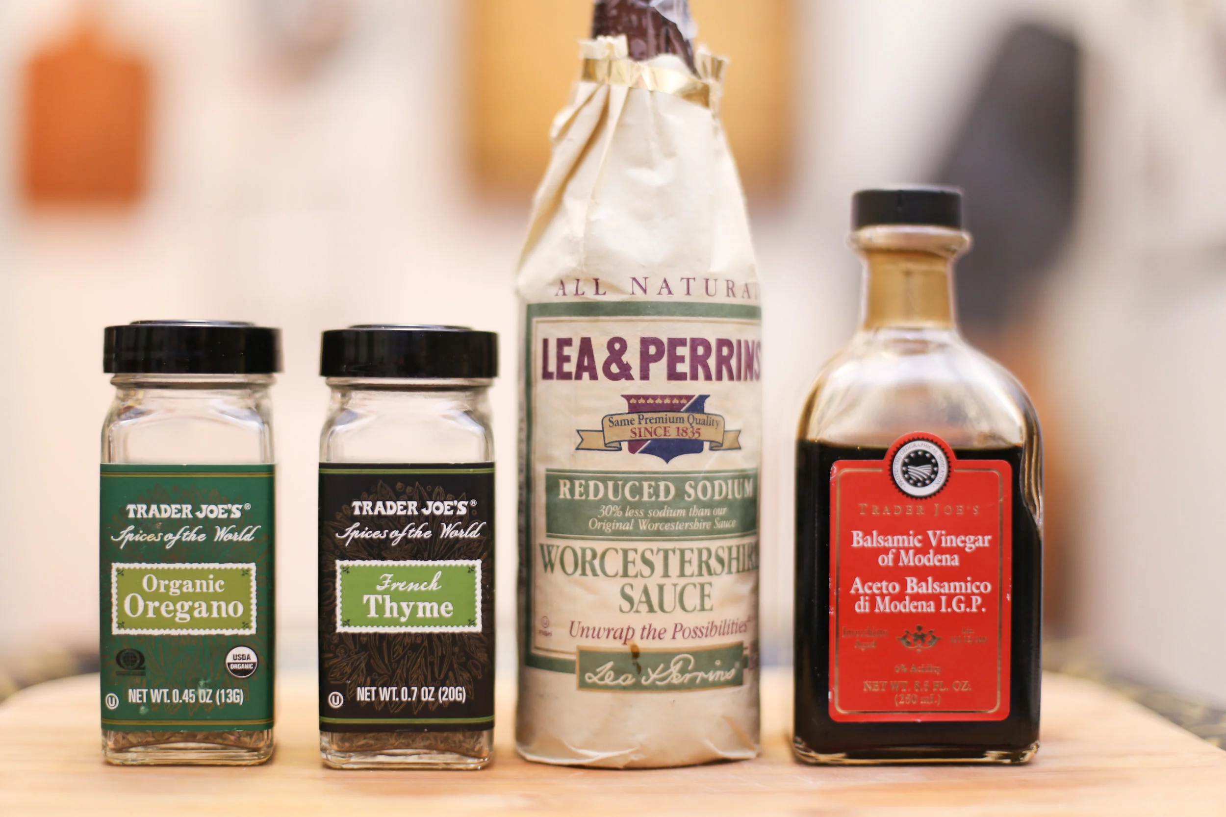 Add the thyme, oregano, worcestershire sauce, and balsamic