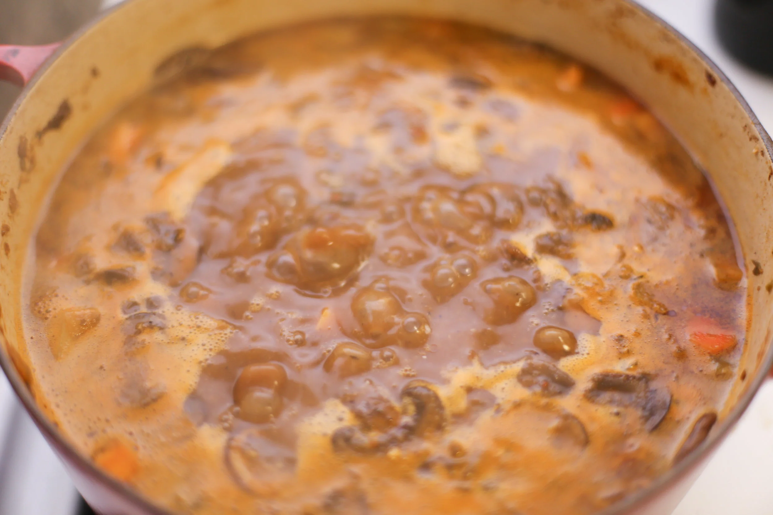 bring down to a simmer and cook for 30 minutes, add the sugar, and then cook uncovered for 10-15 minutes, serve with some hot, crusty, toasted bread, and enjoy!